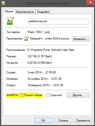 профилем. Удалите ее. Затем подтвердите заново настройки программы. В результате "preferences.xml" должен остаться в Punto Switcher\Data\Punto Switcher\User Data, т.е. в папке директории самой программы, а не в папке настроек программ пользователя (у Вас могут быть другие пути расположения "preferences.xml", в зависимости от оси и типа установки). Возможно "preferences.xml" придётся переместить из "Yandex" в папку директории программы перед удалением папки "Yandex".