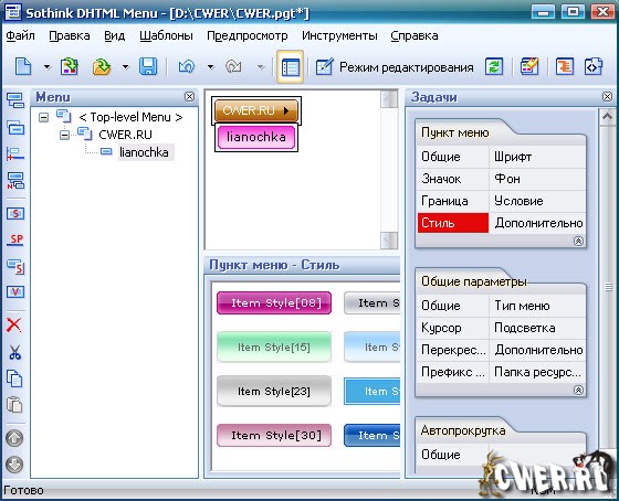Sothink DHTML Menu - программа для создания динамических, древовидных меню для веб страниц. Программа не требует от пользователя навыков в области DHTML или JаvaSсript. Динамические меню можно создавать на основе многочисленных шаблонов или придумать свои собственные. Программа автоматически генерирует код. Создаваемые меню подходят для всех типов браузеров. Очень нужная программа для всех веб-мастеров, кто хочет создать красивое, удобное и функциональное меню. А главное - программа очень проста в использовании и не требует каких-то особых навыков.