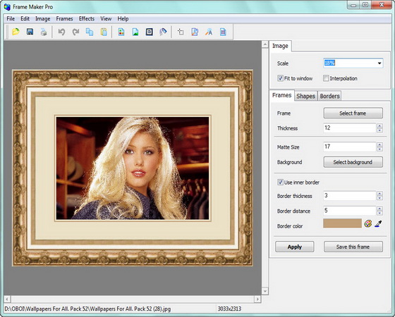 Frame Maker Pro - программа, с помощью которой Вы можете добавить рамки к своим фотографиям. Вы можете выбрать из разнообразия структур и добавить их к вашим изображениям; просмотреть в полнэкранном режиме результат; сохранить ваши созданные изображения в популярных форматах для использования в ваших проектах; напечатайте ваши созданные изображения. Вы можете создать сотни оригинальных и творческих структур и сохранить их.