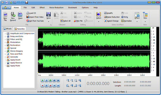 Total Recorder Editor - программа для записи с практически любого источника звука - линейного входа, CD/DVD, микрофона, умеет вести запись телефонных бесед через интернет или интернет-радиостанций. Можно записывать все, что проигрывается любым медиаплеерами, а также записать музыку из игры или любой другой программы. Запись звука происходит в WAV, MP3, WMA, OGG. Имеется мощная функция редактирования записанного, с применением различных эффектов и визуализации обработки, прожига на CD.