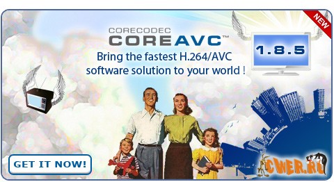 Новая версия H.264 видео кодека разработанного CoreCodec. Кодек CoreAVC базируется на MPEG-4 ч.10 стандарте, и является одним из кодеков используемых в Blu-ray (BD) и в High Definition DVD (HD-DVD). AVC/H.264 - стандарт следующего поколения видео и CoreAVC признаётся одним из лучших и эффективных декодеров H.264. Эффективность CoreAVC заключается в программном подходе к декодированию, он не полагается на аппаратные средсва ПК для увеличения производительности при воспроизведении H.264 видео в отличии от других решений подобного рода. Имеется поддержка деинтерлейсинга на программном уровне.